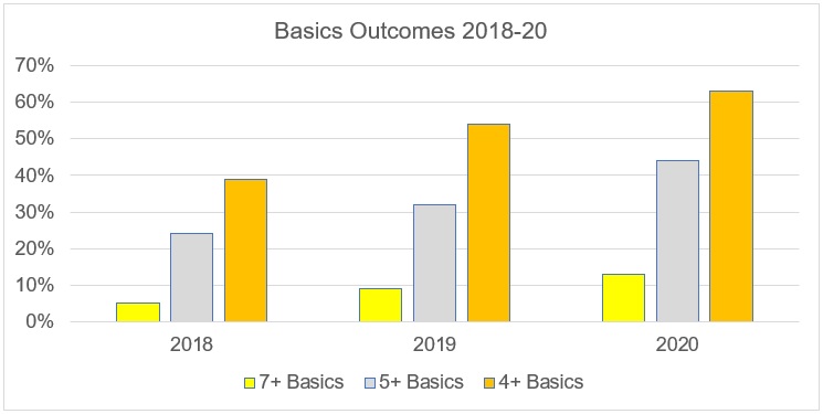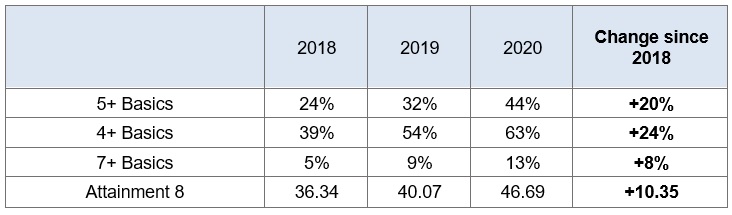 The table below shows outcomes for the Basics Measure (achieving GCSE grades in English and Maths at the key thresholds of grade 7, grade 5 and grade 4). Attainment 8, which includes outcomes for three EBACC subjects (History, Geography, Science, Computer Science or MFL) and three other subjects. The maximum outcome is 90, and an outcome of 50 would mean an average of grade 5 across subjects.