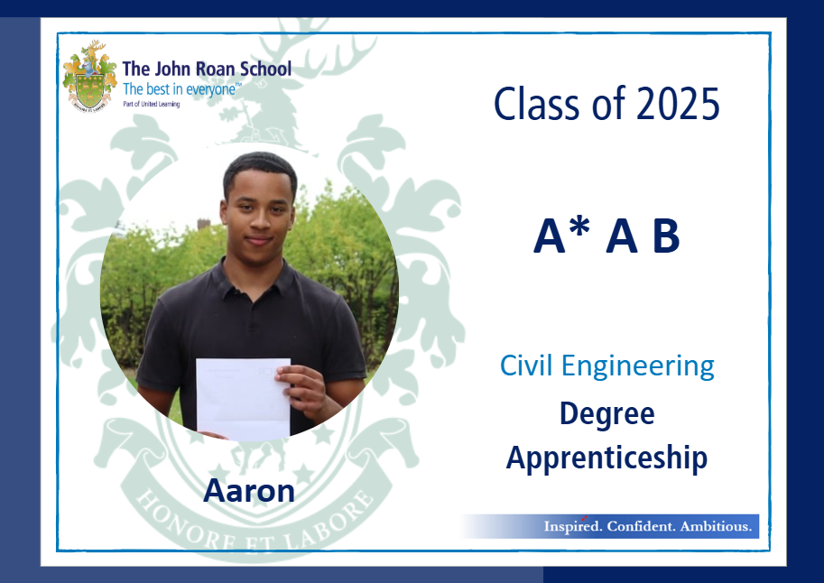 • Aaron, who achieved an A* in Maths, an A in Further Maths and a B in Physics and has secured a place at study a degree apprenticeship in Civil Engineering;