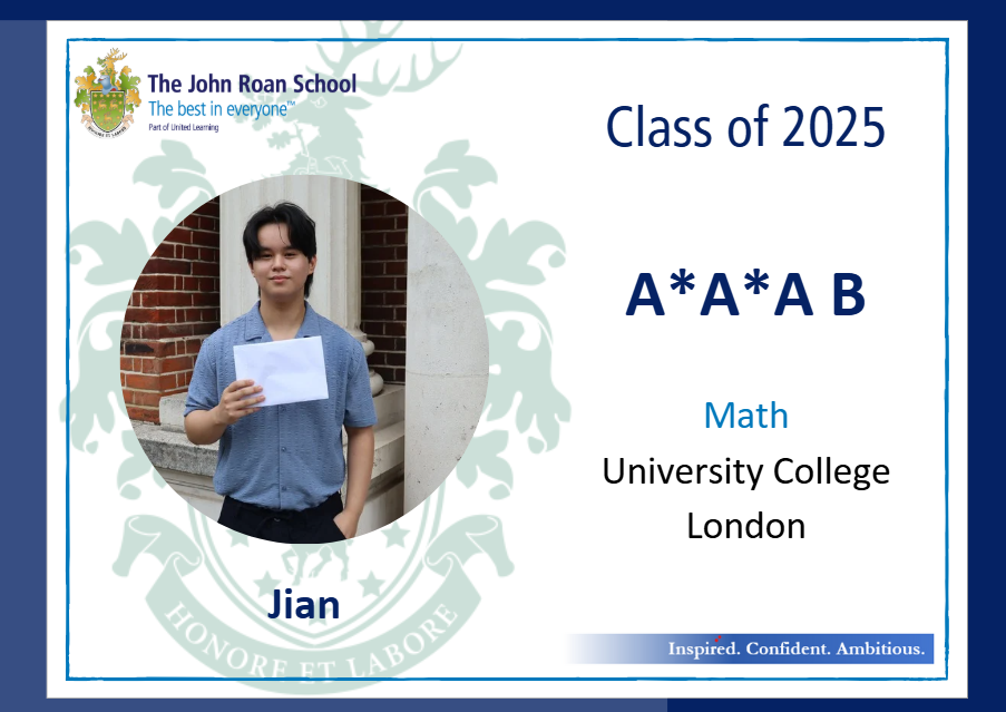 • Jian, who has secured a place at UCL to study Mathematics, having achieved A*s in Maths and Further Maths and As in Physics and Chemistry;