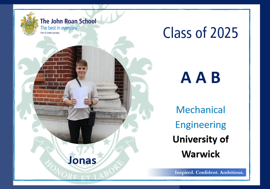 • Jonas, who achieved As in Maths and Physics and a B in Chemistry, thus securing a place at Warwick to study Mechanical Engineering;