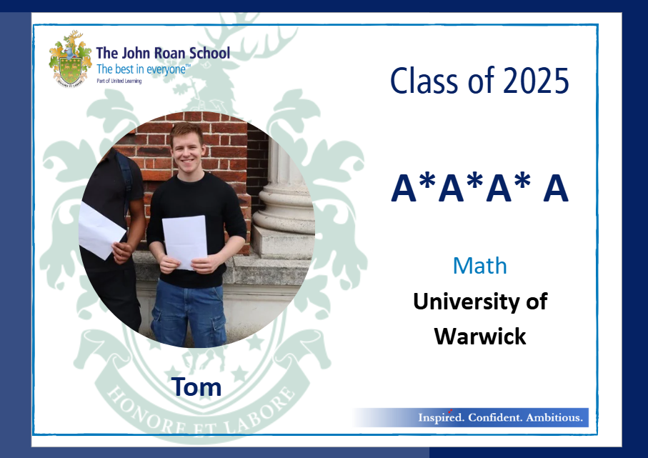 • Tom, who achieved three A*s in Maths, Further Maths, Physics and A in Chemistry and will be taking up a place at Warwick to read Mathematics;